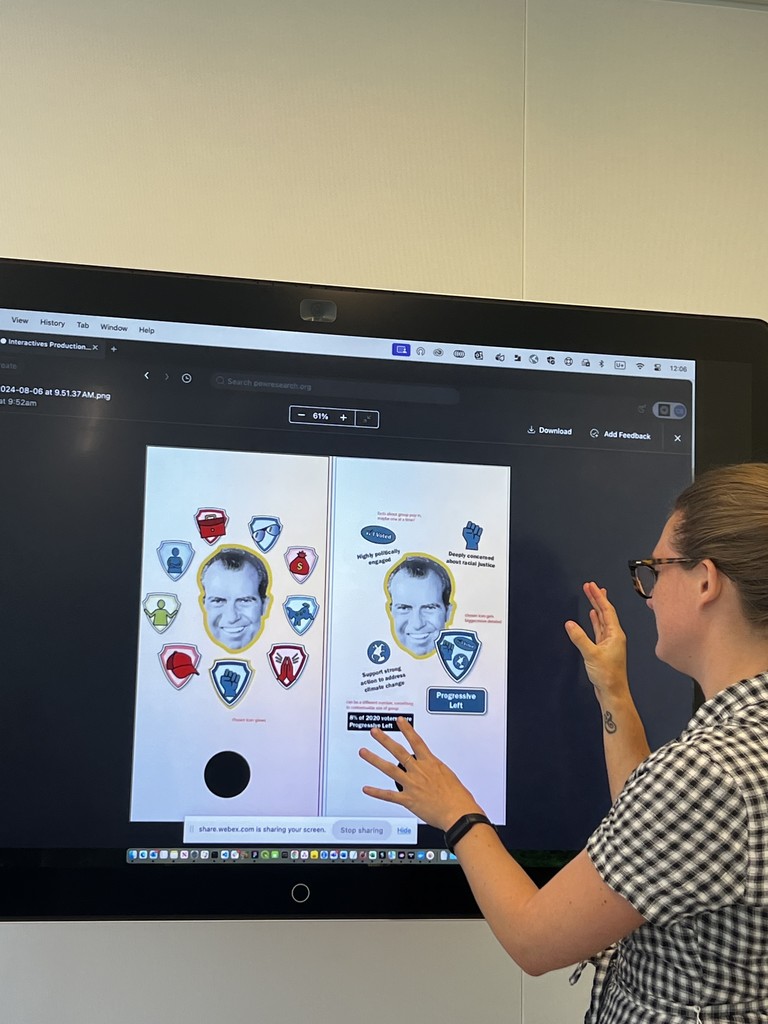 As we approached finalization, we aligned on the results page interaction—specifically the press-and-hold mechanic needed to generate confetti and reveal each user’s political typology badge. We also collaborated as a group to craft the persona explanations and sharing prompts, ensuring that the moment felt rewarding, informative, and naturally shareable.